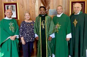 Photo above: (Left to Right) Father George Dunne SSS, lead organizer for the day, and Orlando leader Diana McGinty, Father Benzy, Deacon Jim Ferruzzi, and Monsignor John Bluett