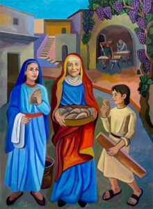 In the spirit of the 125th-anniversary remembrances, and in response to the request for a new image of our beloved Good Saint Ann, the provincial council commissioned a new Eucharistic image of Saint Ann by Joan Steinman of our Corpus Christi Parish in Houston, Texas. Over the winter, Joan took suggestions to gather the Holy Family for their afternoon chores to have an “afternoon snack” with fresh bread!